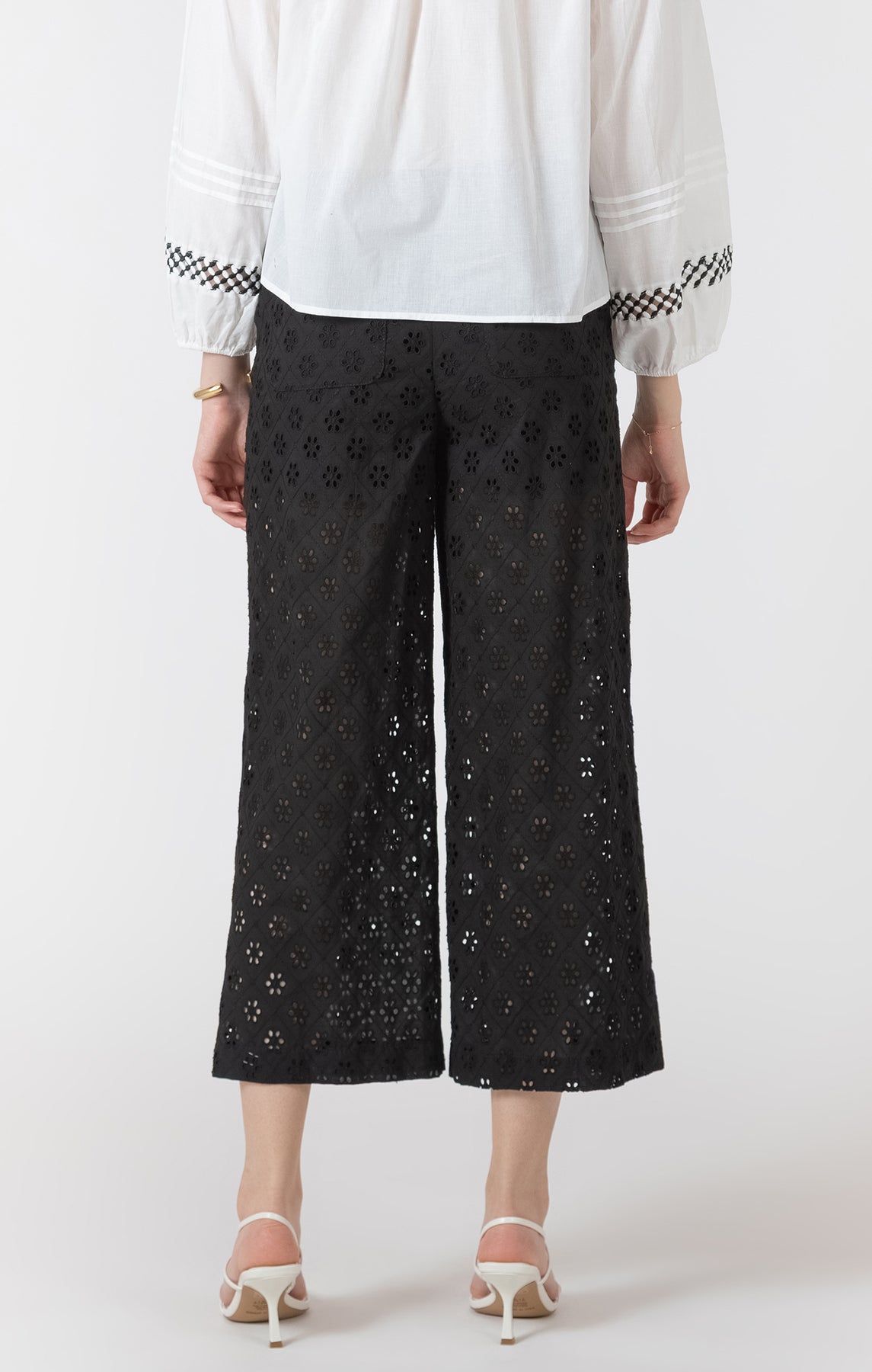 The Peyton Openwork Embroidery Pant features delicate openwork embroidery that makes a sophisticated statement. Short tonal interior lining ensures subtle coverage while maintaining the garment's elegant drape. Wear with the matching top as a coordinated set, or style the pant independently for effortless versatility. Perfect for those who appreciate refined details and timeless design.