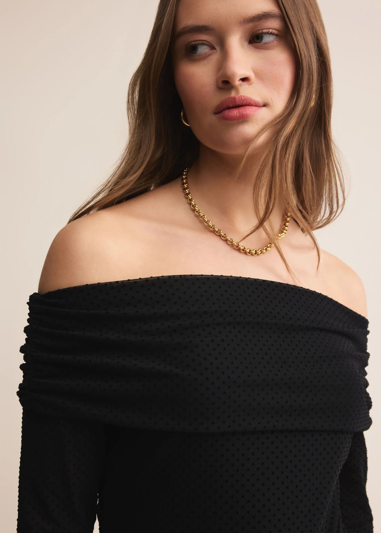 Elevate your night-out wardrobe with this chic off-the-shoulder top. Finished in dotted mesh fabric, the Whimsy top features a fitted silhouette with long sleeves and a fold over off-shoulder neckline.