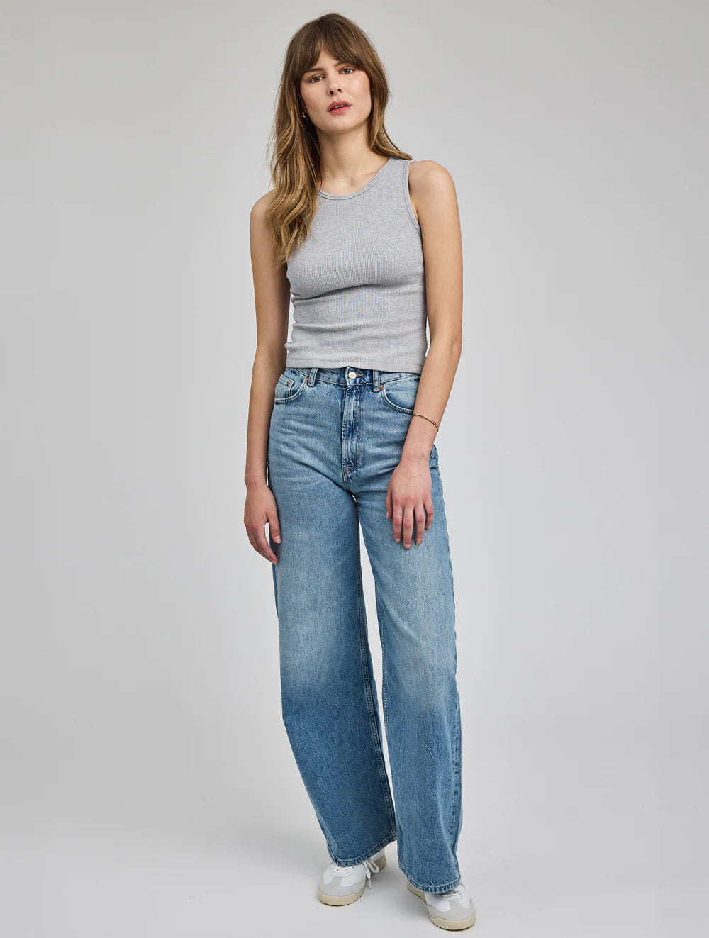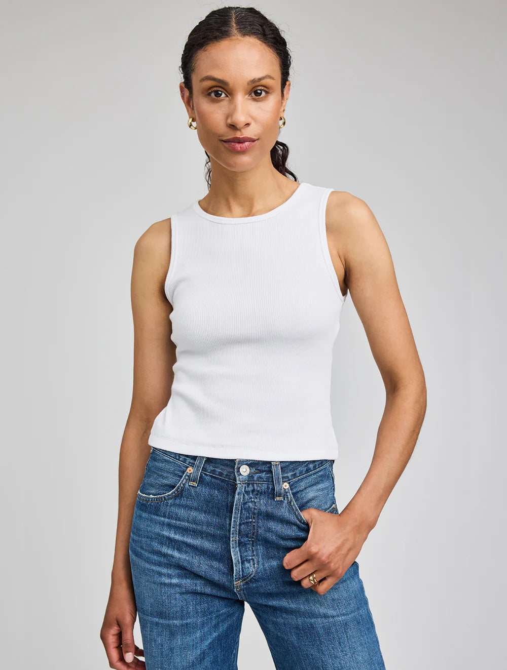 The Daria is a ribbed tank with a scoop neckline. It is made from a mini rib, and hits right at the waist.